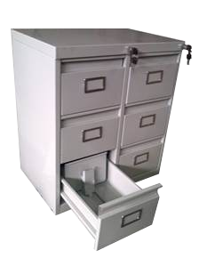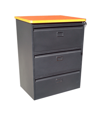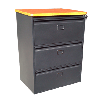 Medida de 1.40 cm. de alto x 70 cm. de fondo x 48 cm. de frente. Fabricado de lámina de 1/32". Incluye tres gavetas inferiores, chapa con cierre y espacio en la parte superior.