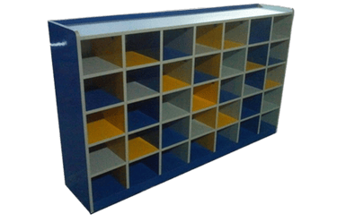 Medidas de 1.20 mt. de frente x 40 cm. de fondo x 1.00 mt. de alto. Libera para kínder, formica de diferentes colores, deslizadero metálico de seis compartimentos.