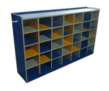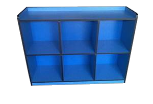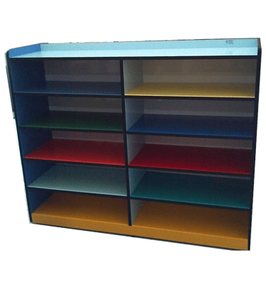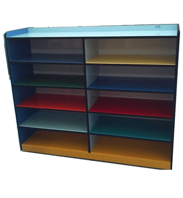 Medidas de 1.20 mt. de alto x 40 cm. de fondo x 2.00 mt. de frente. Librera para parvularia, forrada con formica de diferentes colores, de diez casillas para almacenaje.