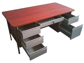 Medidas de 1.50 mt. frente x 60 cm. fondo con una altura de 77 de alto. Fabricado de lámina de 1/32". Incluye tres gavetas laterales, una gaveta central, tacos circulares antideslizantes.