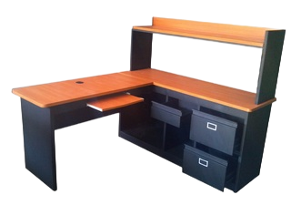 Medidas de 1.60 mt. de frente x 50 cm de fondo, 1.37 mt. de alto. Fabricado de lámina de 1/32". Incluye dos gavetas tipo archivo, pasa cable, una gaveta pequeña y porta teclado.