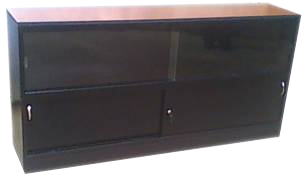 Medidas de 1.00 mt. de frente x 39 cm. de fondo x 1.40 mt. de alto. Fabricado de lámina de 1/64". Incluye puertas corredizas de vidrio, con juego de dos llaves y chapa.