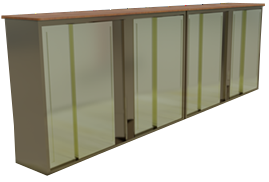 Medidas de 93 cm. de alto x 1.90 mt. de frente x 40 cm. de fondo. Fabricado de lámina de 1/32". Incluye puertas corredizas de vidrio, puertas corrediza de metal, un entrepaño fijo.