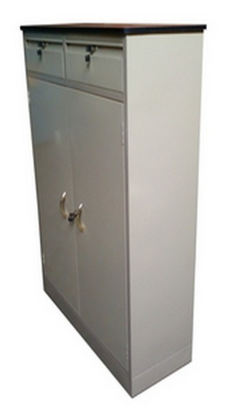 Medidas de 1.40 mt. de alto x 40 cm. de fondo x 1.00 mt. de frente. Fabricado de lámina de 1/32". Incluye dos gavetas en la parte superior con chapa independiente.