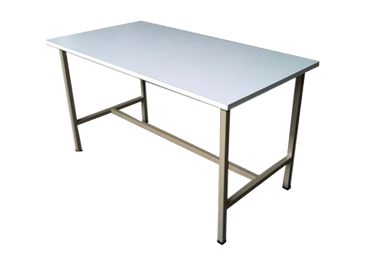 Medidas de 1.20 mt. de fondo x 2.00 mt. de frente x 77 cm. de alto. Fabricada de lámina de 3/64". Mesa ovalada con niveladores de altura.
