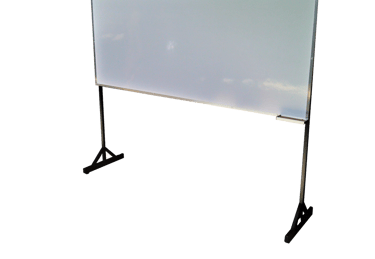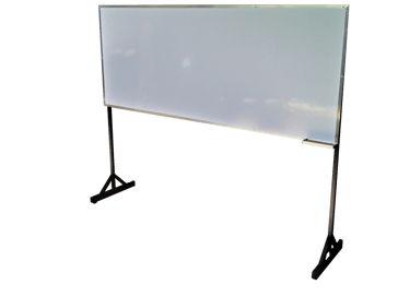 Medidas de 2.44 mt. de frente con una base de 80 cm.x 50 cm. de fondo y 1.20 mt. de alto. Pizarra acrílica con melámina acrílica en ambos lados, con rodos.